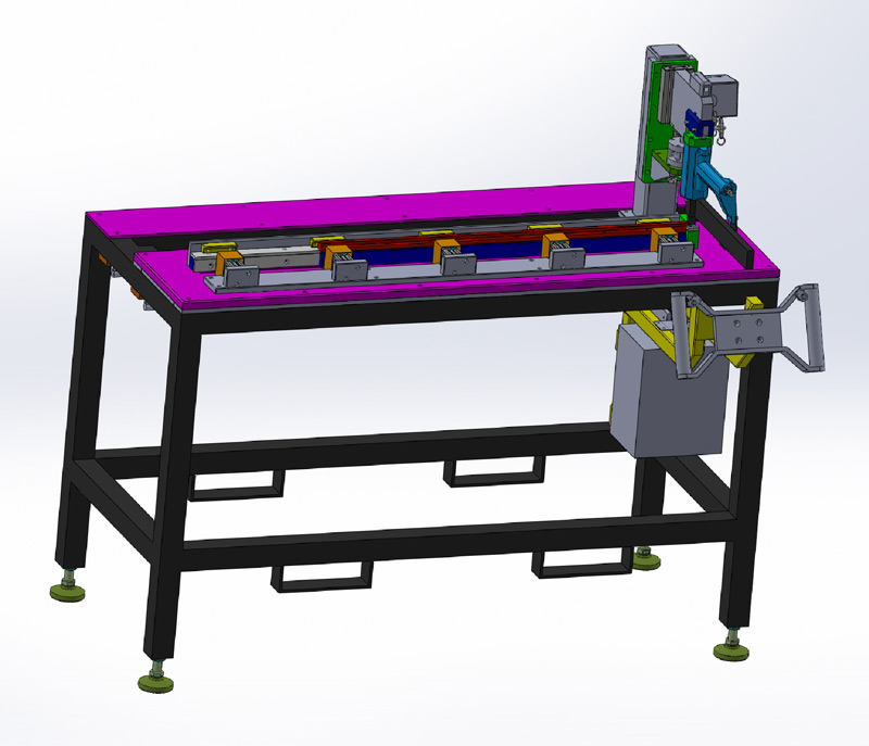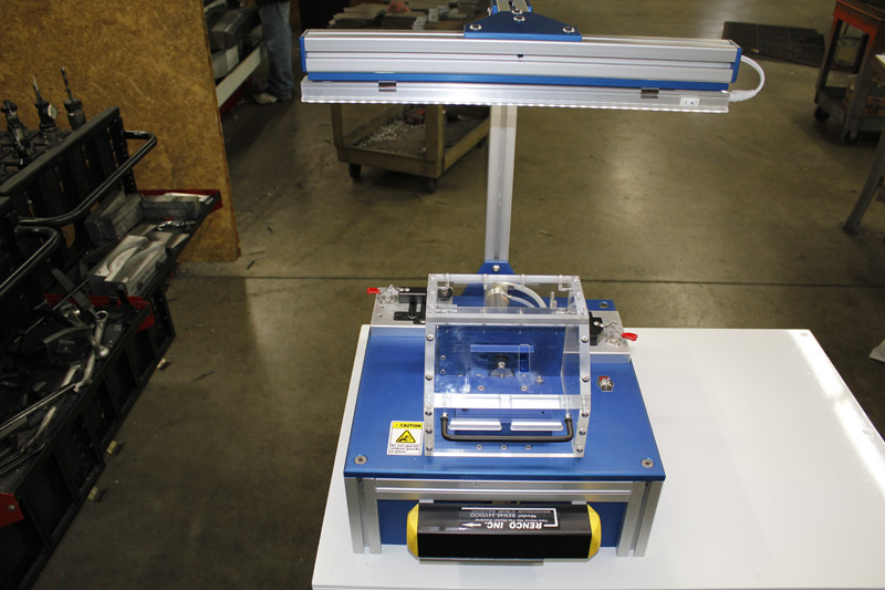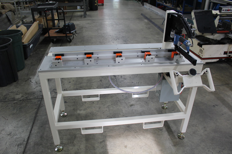 • The machine features a pneumatic two-hand no tie down system integrated with a pneumatic logic system that was designed to automatically clamp the individual components, fire staples, and unclamp the completed assembly