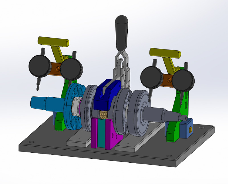 • Just one example of many fixtures that have been designed and engineered by Custom Solutions Manufacturing. This fixture needed to precisely measure runout in an engine crank shaft.
