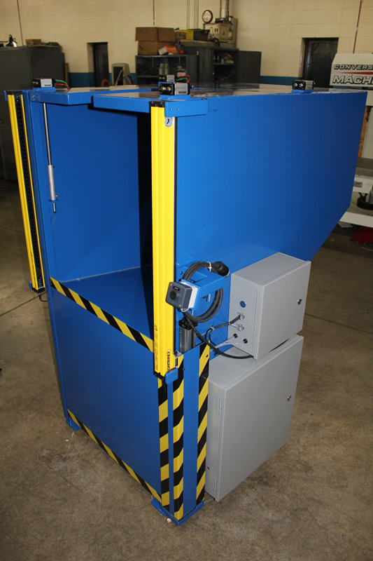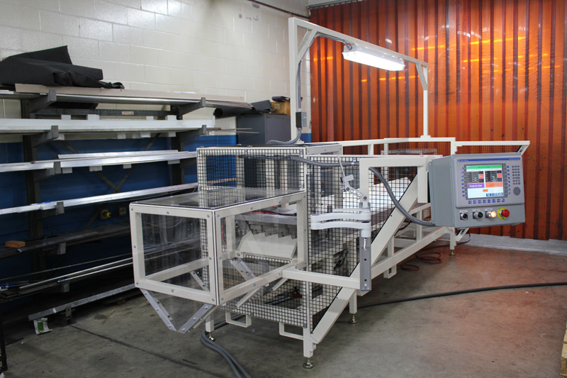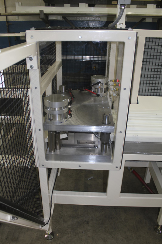• Machine features include an Allen Bradley Panelview 1000 touch screen HMI, safety light curtains, optical sensors, LED indicator lights, Allen Bradley servo motors, and a custom machined, pneumatically-driven die punching system.